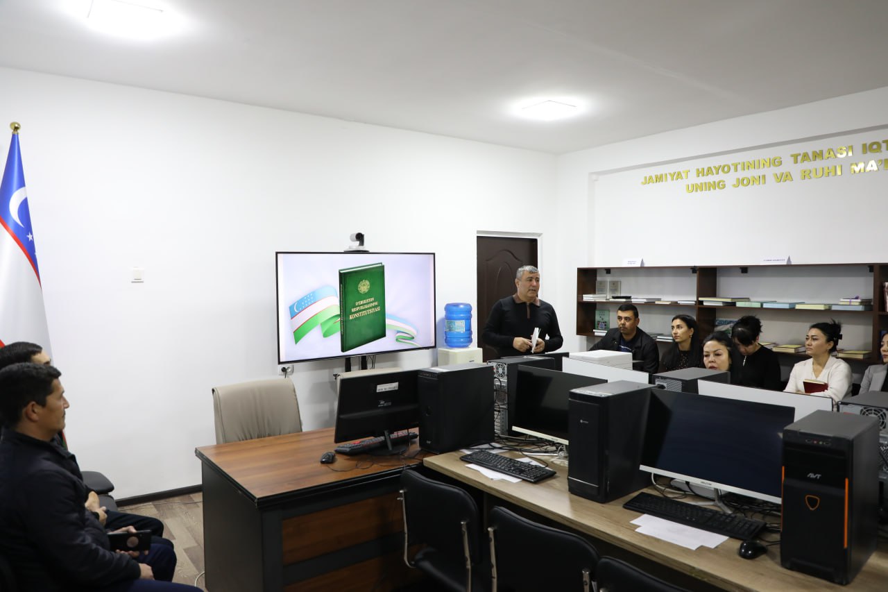 Tadbir davomida boshqarma bosh yuriskonsulti A. Murodov ma’ruza bilan chiqib, Konstitutsiyaning nafaqat huquqiy asos, balki xalqimizning asriy qadriyatlari, ma’naviyati, umid va intilishlarini o‘zida mujassam etgan muhim hujjat ekanligini ta’kidladi.