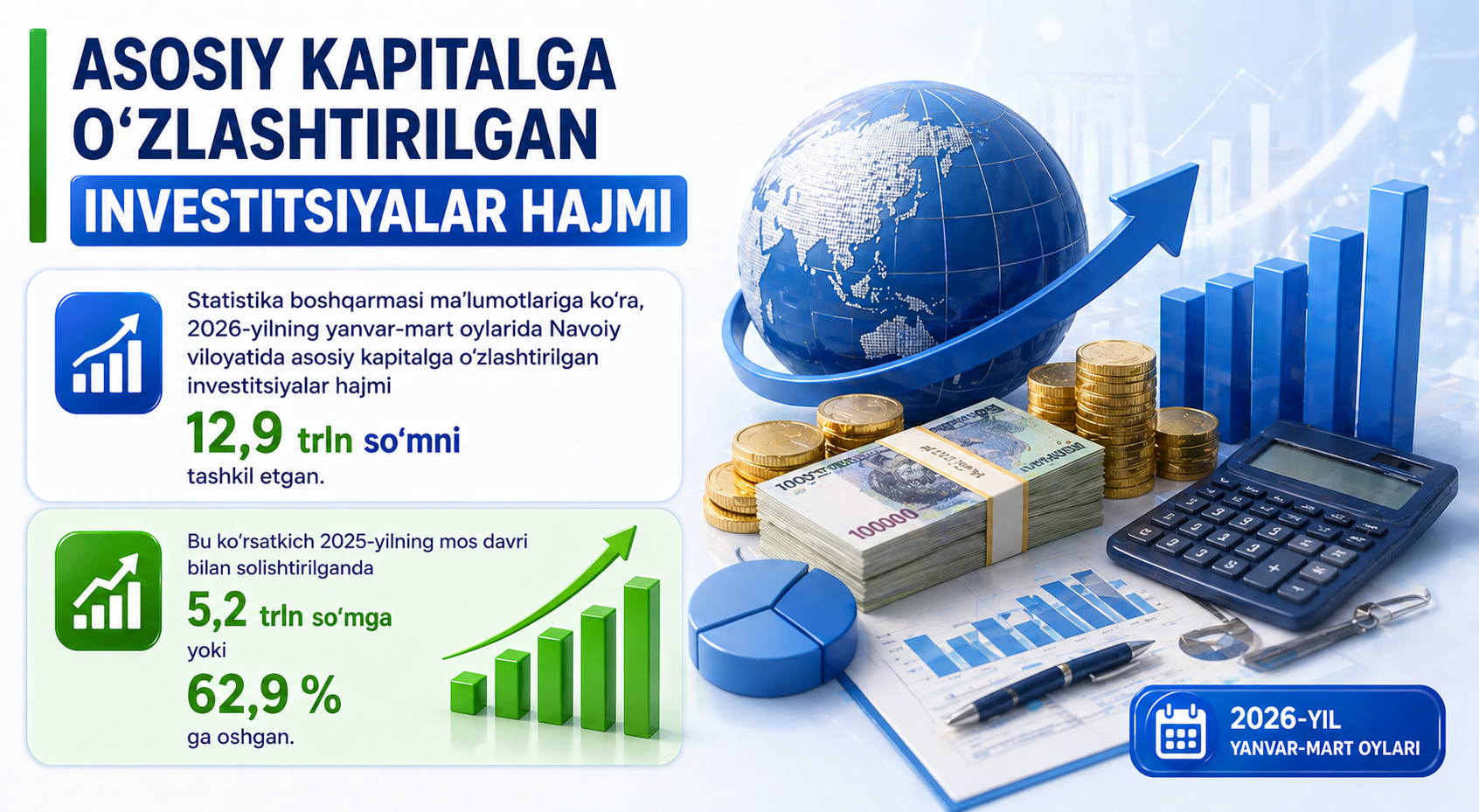 Statistika boshqarmasi ma’lumotlariga ko‘ra, 2026-yilning yanvar-mart oylarida Navoiy viloyatida asosiy kapitalga o‘zlashtirilgan investitsiyalar hajmi 12,9 trln so‘mni tashkil etgan.