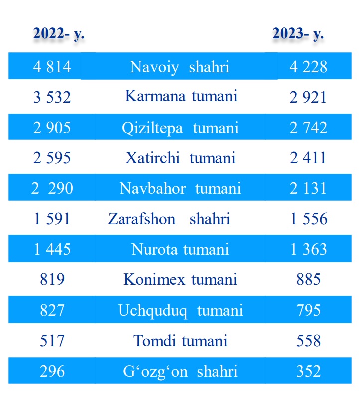 2023- yilning 1- iyul holatiga ko‘ra hududlar bo‘yicha faoliyat yuritayotgan kichik korxona va mikrofirmalarning eng ko‘pi Navoiy shahrida 4 228 tani yoki jamiga nisbatan 21,2 % ni tashkil etdi.
