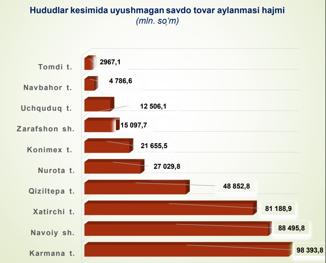 Navoiy viloyati bo‘yicha 2023- yilning yanvar-iyul oylarida uyushmagan savdo tovar aylanmasi 401,7 mlrd. so‘mni tashkil etib, 2022- yilning yanvar-iyul oylariga nisbatan 108,0 % ni tashkil etdi.