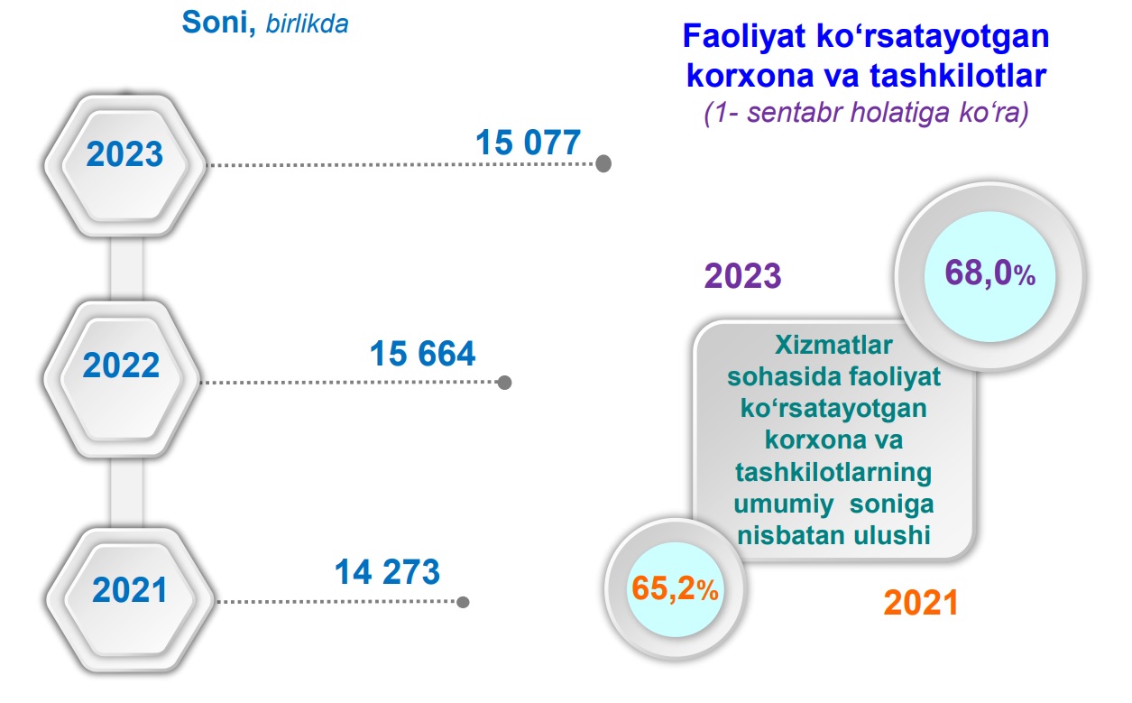 2023-yilning 1-sentabr holatiga ko’ra, Navoiy viloyatida xizmatlar sohasida faoliyat ko‘rsatayotgan korxona va tashkilotlar soni 15 077 taga yetdi. Jamiga nisbatan xizmatlar sohasidagi korxona va tashkilotlar ulushi 68,0 % ni tashkil etdi.