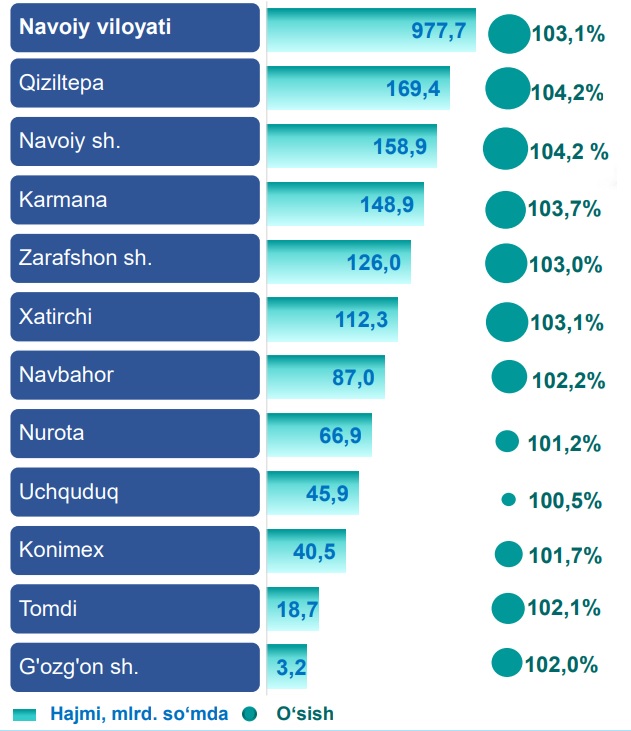 2023-yilning yanvar-avgust oylarida Navoiy viloyatida avtomobil transportida ko‘rsatilgan bozor xizmatlari hajmi 977,7 mlrd. so‘mga yetdi. Ko‘rsatilgan bozor xizmatlarining umumiy hajmidagi ulushi 13,8 % ni tashkil etdi.