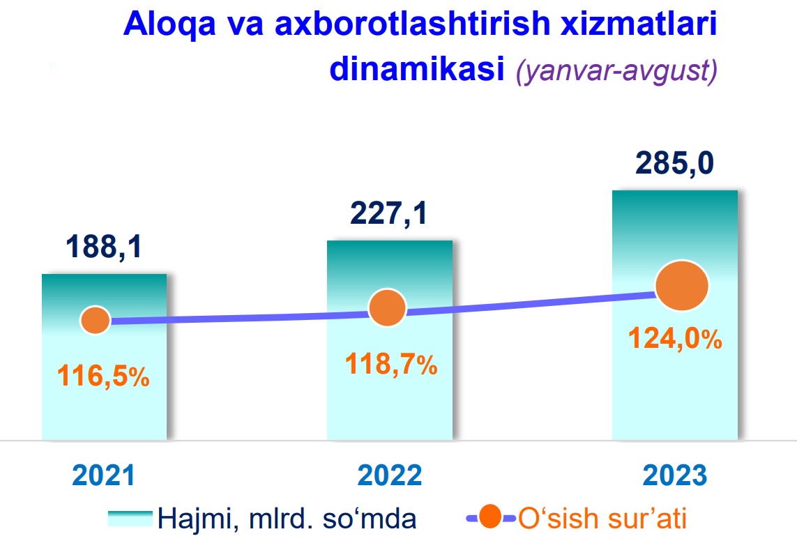 2023-yilning yanvar-avgust oylarida Zarafshon shahrida aloqa va axborotlashtirish xizmatlari hajmi 285,0 mlrd. so‘mdan iborat bo‘lib, o‘tgan yilning mos davriga nisbatan o‘sish sur’ati 124,0 % ni tashkil etdi.