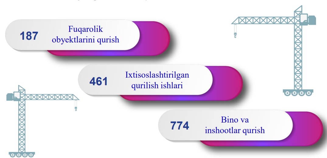 - ixtisoslashtirilgan qurilish ishlari yo‘nalishi 32,4 foiz ulushni tashkil etdi.