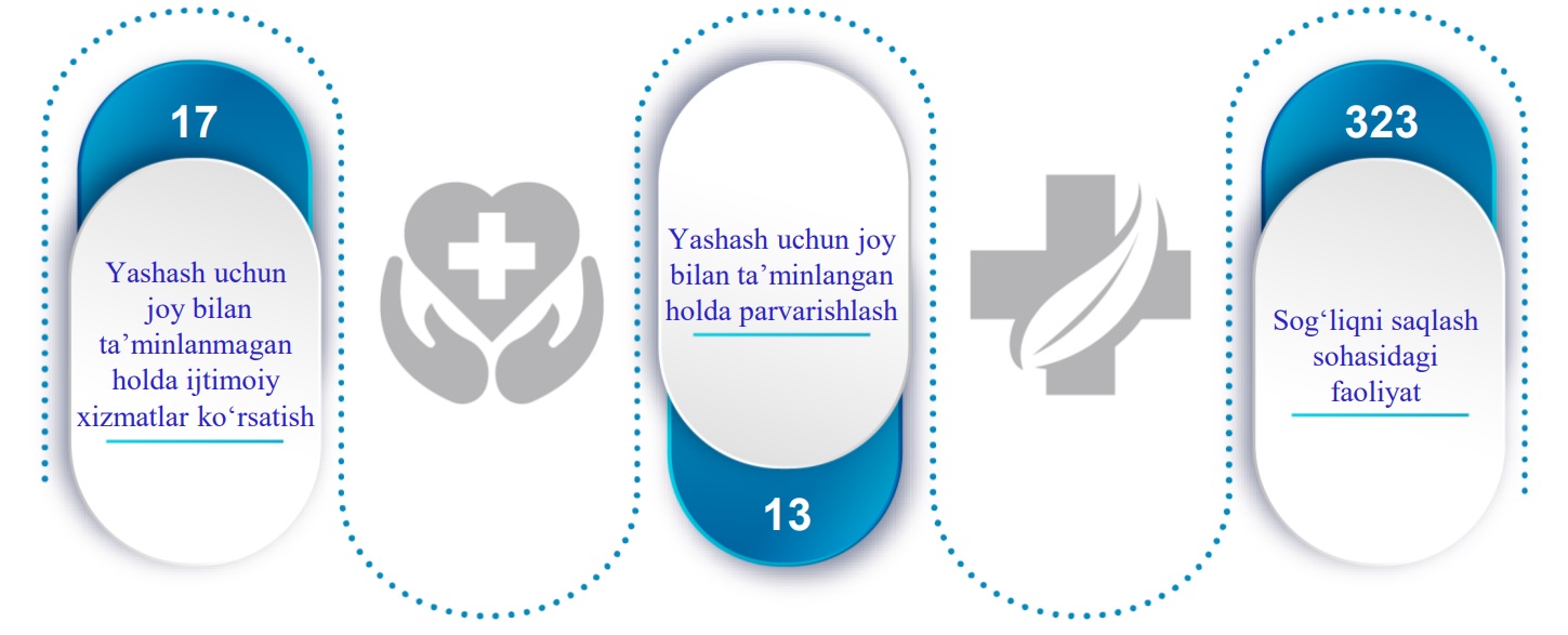Yo‘nalishlar bo‘yicha tahlil shuni ko‘rsatdiki: 91,5 foiz korxonalar sog‘liqni saqlash yo‘nalishiga to‘g‘ri kelib, o‘sish sur’ati 2020- yilning mos davriga nisbatan o‘sish 121,4 foizni tashkil etdi; Yashash uchun joy bilan ta’minlangan holda parvarishlash yo‘nalishidagi korxonalar soni 3,7 foizni tashkil etib, 2020- yilning mos davriga nisbatan o‘sish sur’ati 216,7 foizni tashkil etdi; Yashash uchun joy bilan ta’minlanmagan holda ijtimoiy xizmatlar ko‘rsatish yo‘nalishidagi korxonalar soni ushbu sohaning 4,8 foizini tashkil etib, 2020- yilning mos davriga nisbatan o‘sish sur’ati 130,8 foizni tashkil etdi;