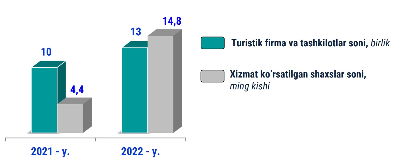 2023-yil 1-yanvar holatiga ko'ra, Navoiy viloyatida turistik firma va tashkilotlar soni 13 tani tashkil etdi. Ular tomonidan 14,8 ming nafar shaxslarga xizmat ko‘rsatilib, O‘zbekiston Respublikasi bo‘ylab sayohatga jo‘natildi.