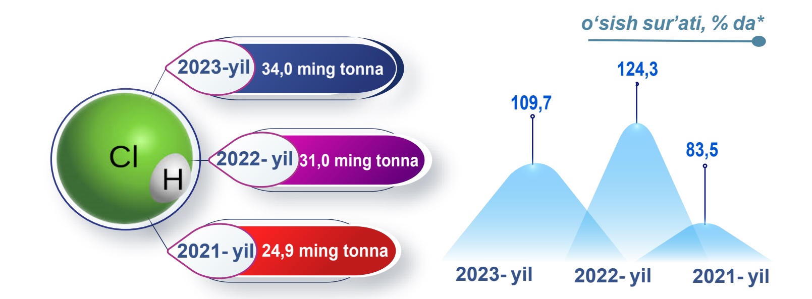 2023-yilning yanvar-avgust oylarida Navoiy viloyatida yirik korxonalar tomonidan jami 34,0 ming tonna vodorod xlorid (xlorid kislota) ishlab chiqarilib, ushbu ko‘rsatkich o‘tgan yilning mos davriga nisbatan 109,7 % ni tashkil etgan.