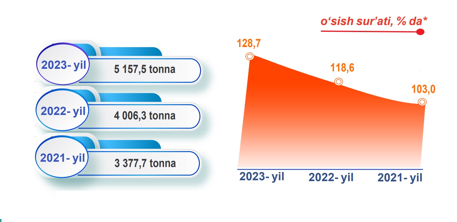 2023-yilning yanvar-avgust oylarida Navoiy viloyatida plastmassadan qattiq quvurlar, trubkalar va shlanglar ishlab chiqarishda, jami 5 157,5 tonna plastmassadan qattiq quvurlar, trubkalar va shlanglar ishlab chiqarildi, o‘tgan yilning mos davriga nisbatan 28,7 % ga ko‘paygan.