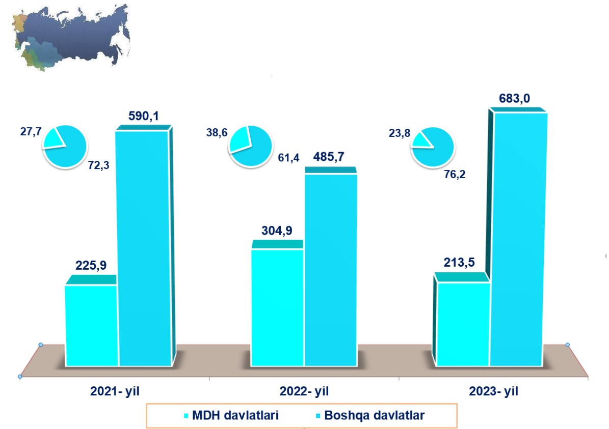 2023-yil yanvar-avgust oylarida Navoiy viloyatining tashqi savdo aylanmasida MDH mamlakatlari va boshqa xorijiy davlatlarning hajmlari dinamikasi (mln. AQSH dollari, ulushi, % da).