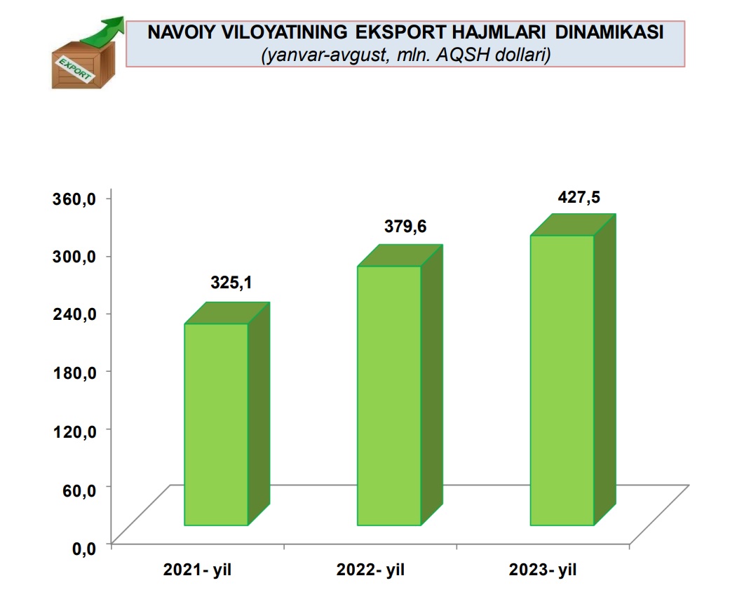 2023-yil yanvar-avgust oylarida Navoiy viloyatining eksport hajmi 427,5 mln. AQSH dollarini tashkil etdi.