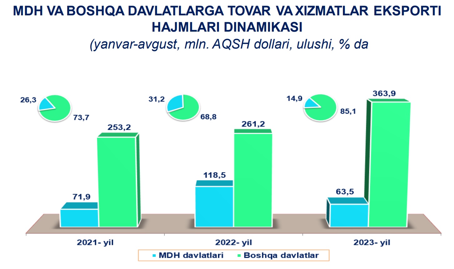 2023-yilning yanvar-avgust oylarida MDH mamlakatlariga 63,5 mln. AQSH dollari qiymatidagi tovar va xizmatlar eksport qilinib, jami eksportning 14,9 % ini tashkil etdi.