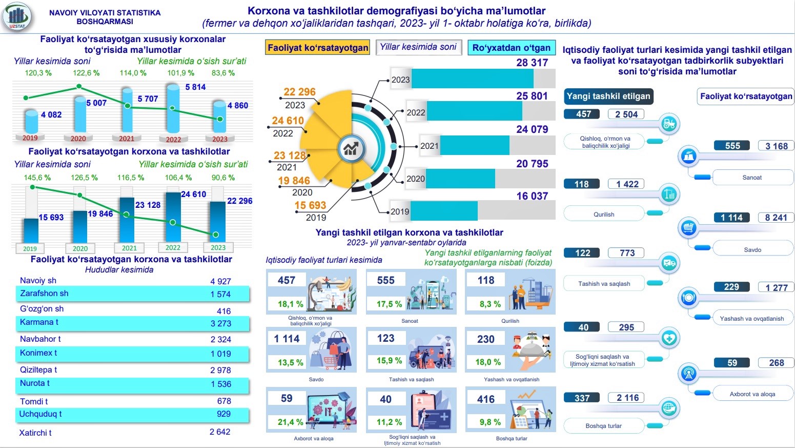 2023-yilning 1-oktabr holatiga viloyatimizda faoliyat koʻrsatayotgan, yangi tashkil etilgan korxona va tashkilotlar hamda iqtisodiy faoliyat turlari kesimida yangi tashkil etilgan va faoliyat koʻrsatayotgan tadbirkorlik subyektlari soni toʻgʻrisida infografik tahlil.