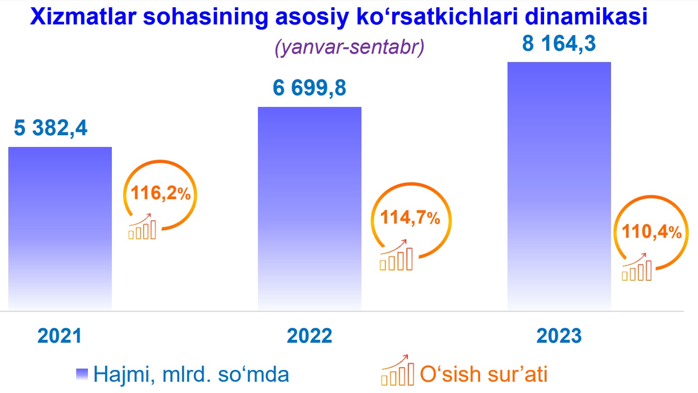 2023-yilning yanvar-sentabr oylarida Navoiy viloyatida koʻrsatilgan bozor xizmatlari hajmi 8 164,3 mlrd. soʻmga yetdi va 2022-yilning mos davriga nisbatan solishtirilganda oʻsish sur’ati 110,4 % ni tashkil etdi.