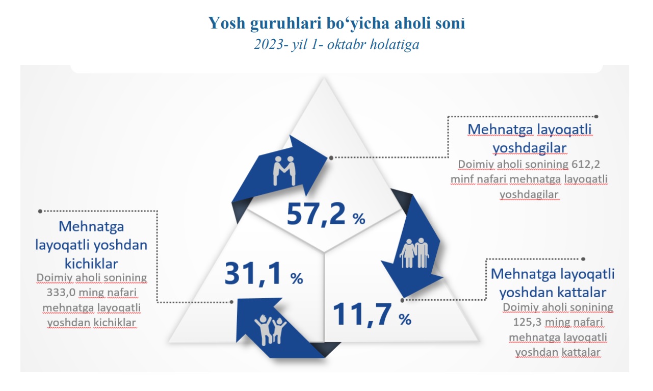 2023-yil 1-oktabr holatiga ko‘ra, Navoiy viloyati doimiy aholisi sonining 31,1 % i mehnatga layoqatli yoshdan kichiklar, 57,2 % i mehnatga layoqatli yoshdagilar va 11,7 % i mehnatga layoqatli yoshdan kattalar hissasiga to‘g‘ri kelmoqda.