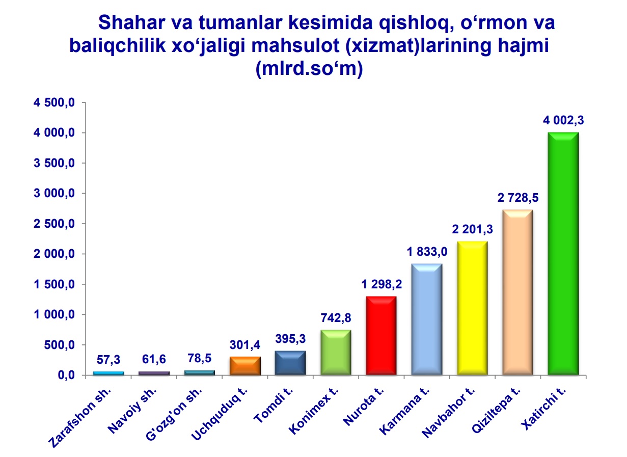 2023-yilning yanvar-sentabr oylarida, shahar va tumanlar kesimida qishloq, o‘rmon va baliqchilik xo‘jaligi mahsulot (xizmat) larining eng yuqori hajmi Xatirchi (4 002,3 mlrd. so‘m), Qiziltepa (2 728,5 mlrd. so‘m) va Navbahor (2 201,3 mlrd. so‘m) tumanlariga qayd etildi.