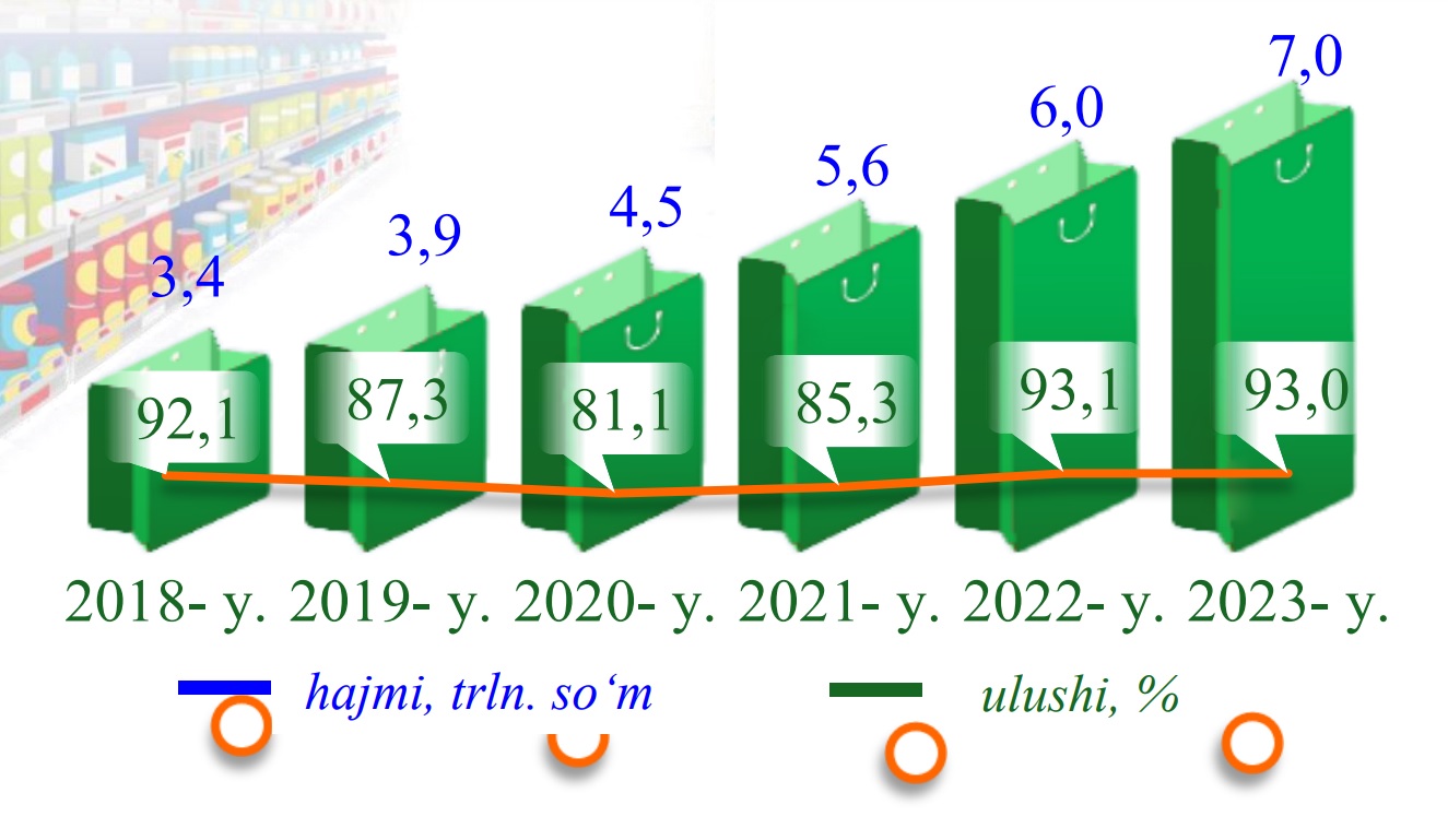2023-yilning yanvar-sentabr oylarida Navoiy viloyatida kichik tadbirkorlik subyektlarining chakana savdo tovar aylanmasi hajmi 7,0 trln. so‘mni yoki umumiy chakana savdo tovar aylanmasining 93,0 % ini tashkil etib, o‘sish sur‘ati 2022-yilning tegishli davriga nisbatan 105,7 % ni tashkil qildi.