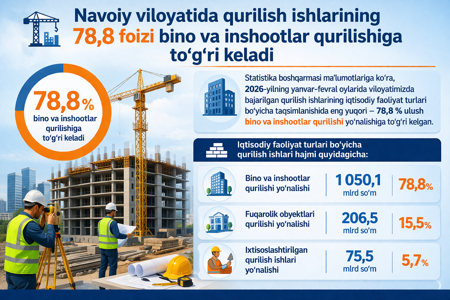 Statistika boshqarmasi ma’lumotlariga ko‘ra, 2026-yilning yanvar-fevral oylarida viloyatimizda bajarilgan qurilish ishlarining iqtisodiy faoliyat turlari bo‘yicha taqsimlanishida eng yuqori – 78,8 % ulush bino va inshootlar qurilishi yo‘nalishiga to‘g‘ri kelgan.