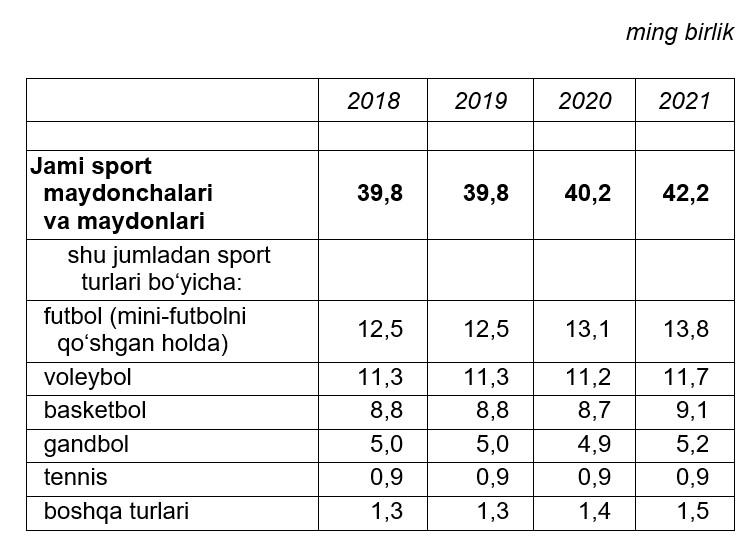 2022-yil 1-yanvar holatiga ko‘ra, O‘zbekistonda 42,2 ming sport maydonchalari va maydonlari qayd etilgan bo‘lsa, 2018-yilga nisbatan ularning soni 1,1 barobarga oshgan.