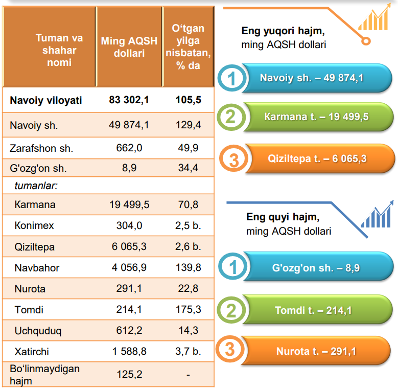 2023- yilning yanvar oyida Navoiy viloyatining tashqi savdo aylanmasi tarkibida eng yuqori ulushni Nаvoiy shahri 59,9 % ulush bilan 49 874,1 ming AQSH dollarini tashkil etdi.