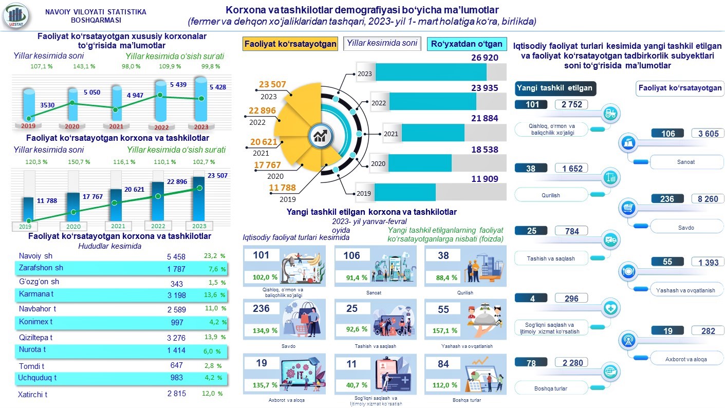 Viloyat statistika boshqarmasi tomonidan 2023- yilning 1-mart holatiga viloyatimizda faoliyat koʻrsatayotgan, yangi tashkil etilgan korxona va tashkilotlar hamda iqtisodiy faoliyat turlari kesimida yangi tashkil etilgan va faoliyat koʻrsatayotgan tadbirkorlik subyektlari soni toʻgʻrisida infografik tahlil.