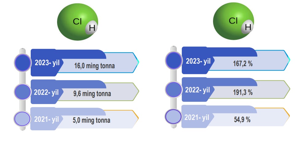 2023- yilning yanvar-fevral oylarida Navoiy viloyati bo’yicha yirik korxonalar tomonidan jami 16,0 ming tonna vodorod xlorid (xlorid kislota) ishlab chiqarilib, ushbu ko‘rsatkich o‘tgan yilning mos davriga nisbatan 67,2 % ga oshgan.