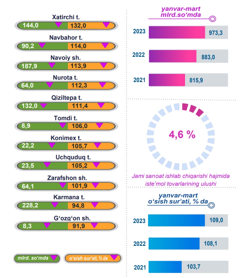 2023- yilning yanvar-mart oylarida hududlar kesimida iste’mol tovarlari ishlab chiqarilishining viloyat jami hajmidagi eng yuqori ulushi Karmana tumaniga to‘g‘ri kelib, 23,4 %, shuningdek, Navoiy shahri 19,3 %, Xatirchi tumani 14,8 %, Qiziltepa tumani 13,6 % ekanligi kuzatildi.