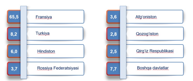 2023- yilning yanvar-aprel oylari yakunida tovar va xizmatlar eksporti boʻyicha asosiy hamkor davlatlar tarkibida Fransiya (eksport umumiy hajmining 65,5 %), Тurkiya (8,2 %), Hindiston (6,0 %), Rossiya Federatsiyasi (3,7 %), Аfgʻoniston (3,6 %), Qozogʻiston (2,8 %) va Qirgʻiz Respublikasi (2,5 %) saqlanib qolmoqda hamda ularning jami eksportdagi ulushi 92,3 % ni tashkil etmoqda.