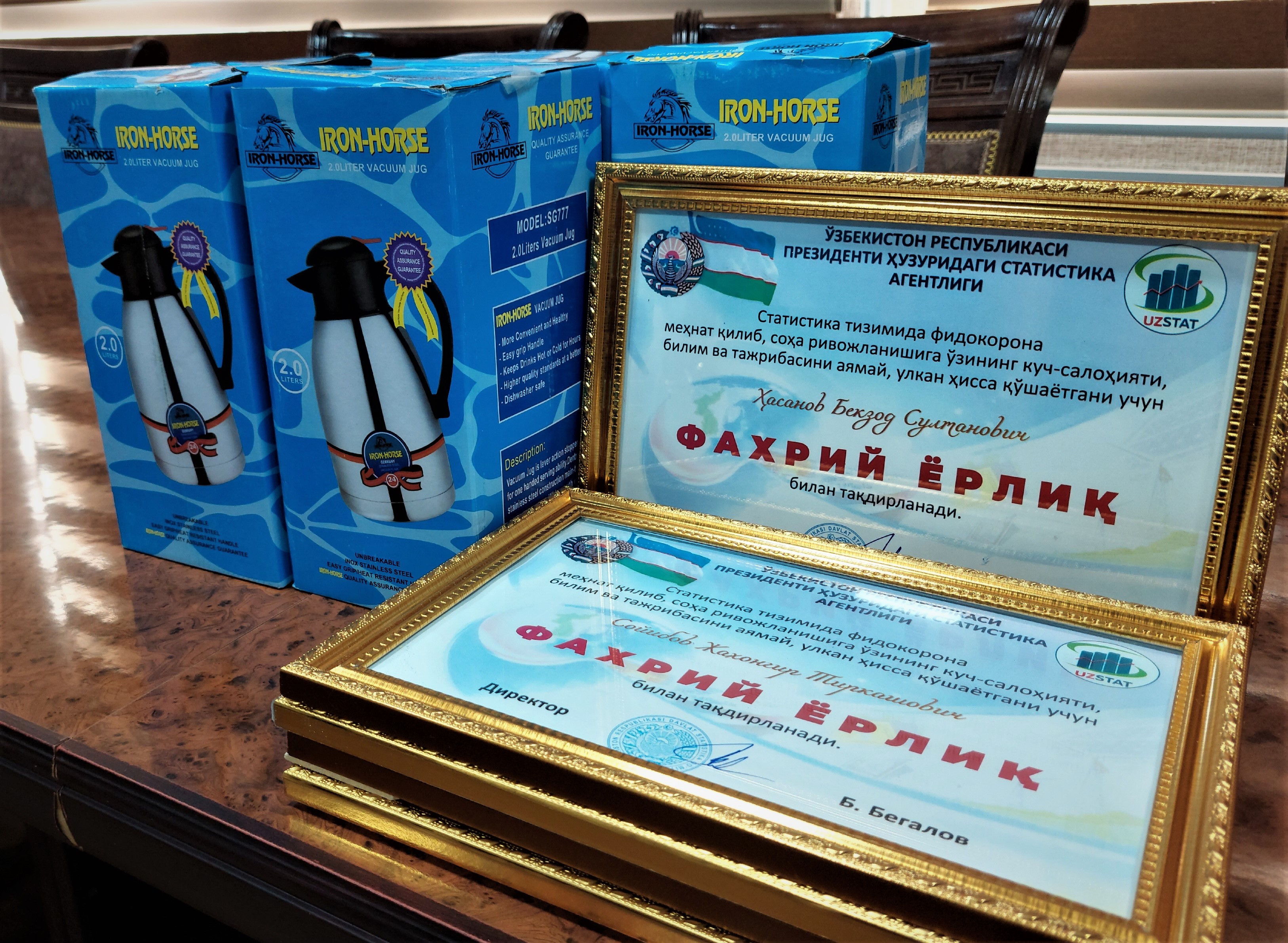 2023-yilning 28-dekabr kuni Navoiy viloyati statistika boshqarmasida tarmoq va hududiy statistika boʻlim boshliqlariga tizimda fidokorona mehnat qilib, soha rivojlanishiga oʻzining kuch-salohiyati, bilim va tajribasini ayamay, ulkan hissa qoʻshayotgani uchun Statistika agentligi rahbarining faxriy yorliq va esdalik sovgʻalari topshirildi.