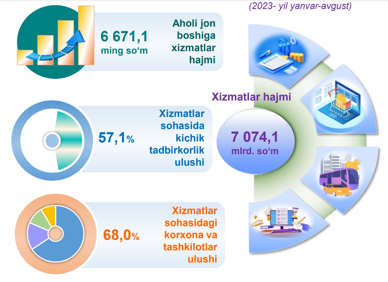 2023-yil yanvar-iyul oylarida respublikada koʻchmas mulk bilan bogʻliq xizmatlar hajmi 6 340,8 mlrd. soʻmni tashkil etib, jami koʻrsatilgan bozor xizmatlari hajmidagi ulushi 2,5 %ni tashkil etdi.