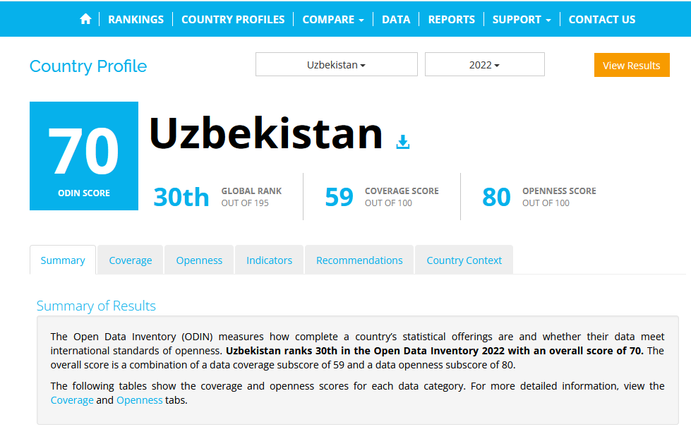 Oʻzbekiston Respublikasi Open Data Inventory (ODIN) ochiq ma’lumotlar reytingida 70 ball toʻplagan holda dunyoda 30-oʻringa ko‘tarildi.