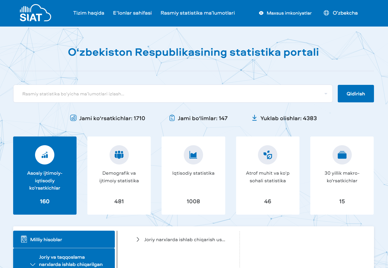 Davlat statistika qoʻmitasi tomonidan Statistika integrallashgan axborot tizimi (SIAT) yaratildi hamda uning negizida siat.stat.uz Oʻzbekiston Respublikasi statistika portali ishga tushirildi.